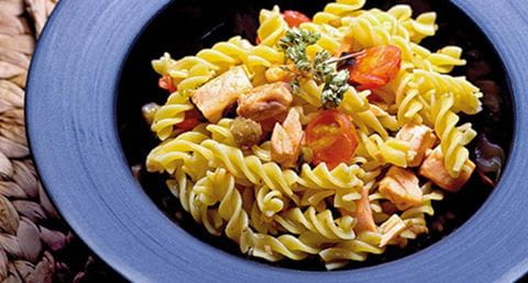 Fusilli com salmão e beringela