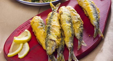 Sardinha frita em polme e migas de caldo verde com feijão frade
