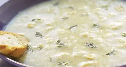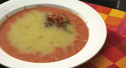 Creme bicolor de beterraba e de courgette com estaladiço de bacon