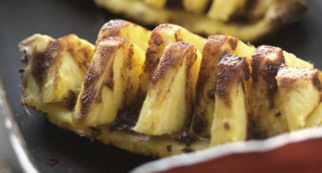 - Misture a canela com o açúcar e a noz moscada. Adicione a margarina Vaqueiro e esmague com um garfo até obter uma massa tipo areia. Distribua sobre os quartos de abacaxi e regue com um pouco de sumo da lima.
