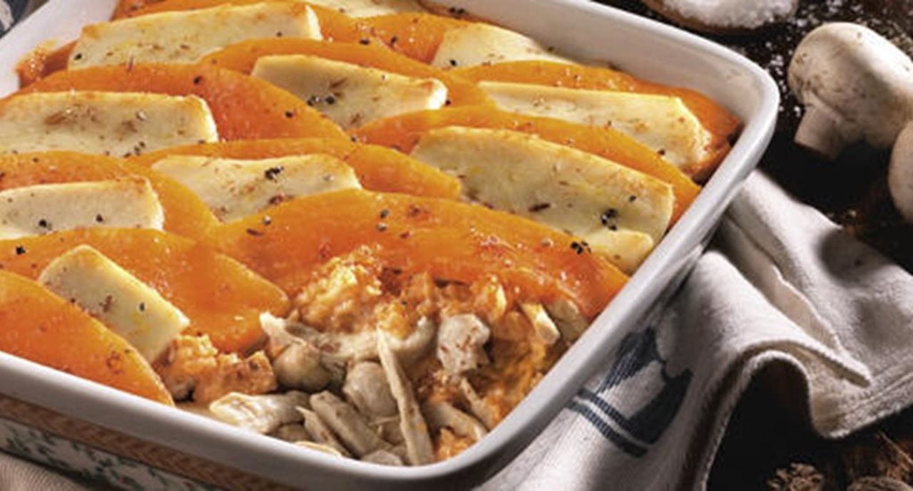 - Deite parte do puré de abóbora um tabuleiro de forno que possa ir à mesa. Por cima espalhe o frango com os cogumelos e cubra com o restante puré de abóbora.