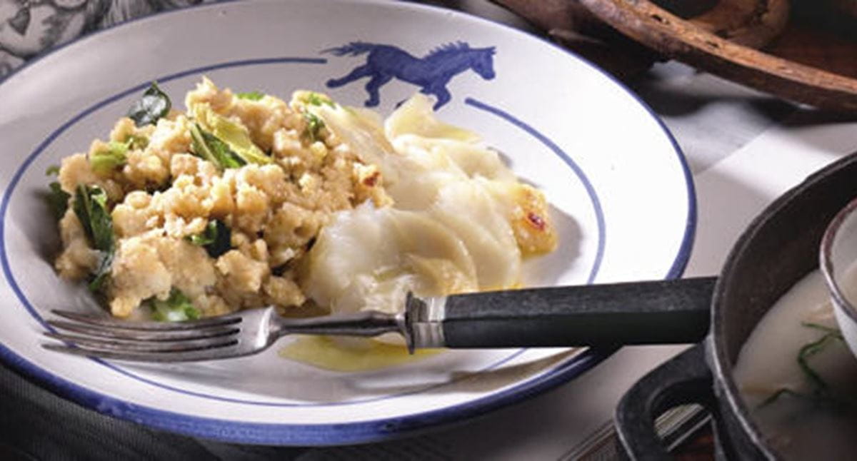 - Junte a broa de milho esfarelada e bata energicamente com uma colher de pau. Abra uma cavidade ao meio do preparado e deite aí os dentes de alho, descascados e finamente picados, e o azeite.
