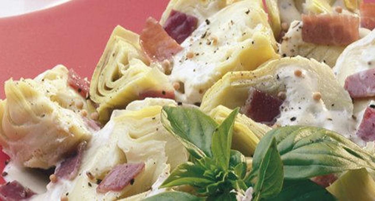 - Escorra muito bem os corações de alcachofras e corte-os ao meio. Leve ao lume a margarina Vaqueiro com o presunto cortado em bocadinhos e deixe derreter. Junte as alcachofras, mexa, tape e deixe suar um pouco. Tempere com a mostarda e a pimenta preta, moída grosseiramente. Regue com as natas e adicione o vinagre. Rectifique o sal e deixe ferver suavemente durante cerca de 15 minutos.