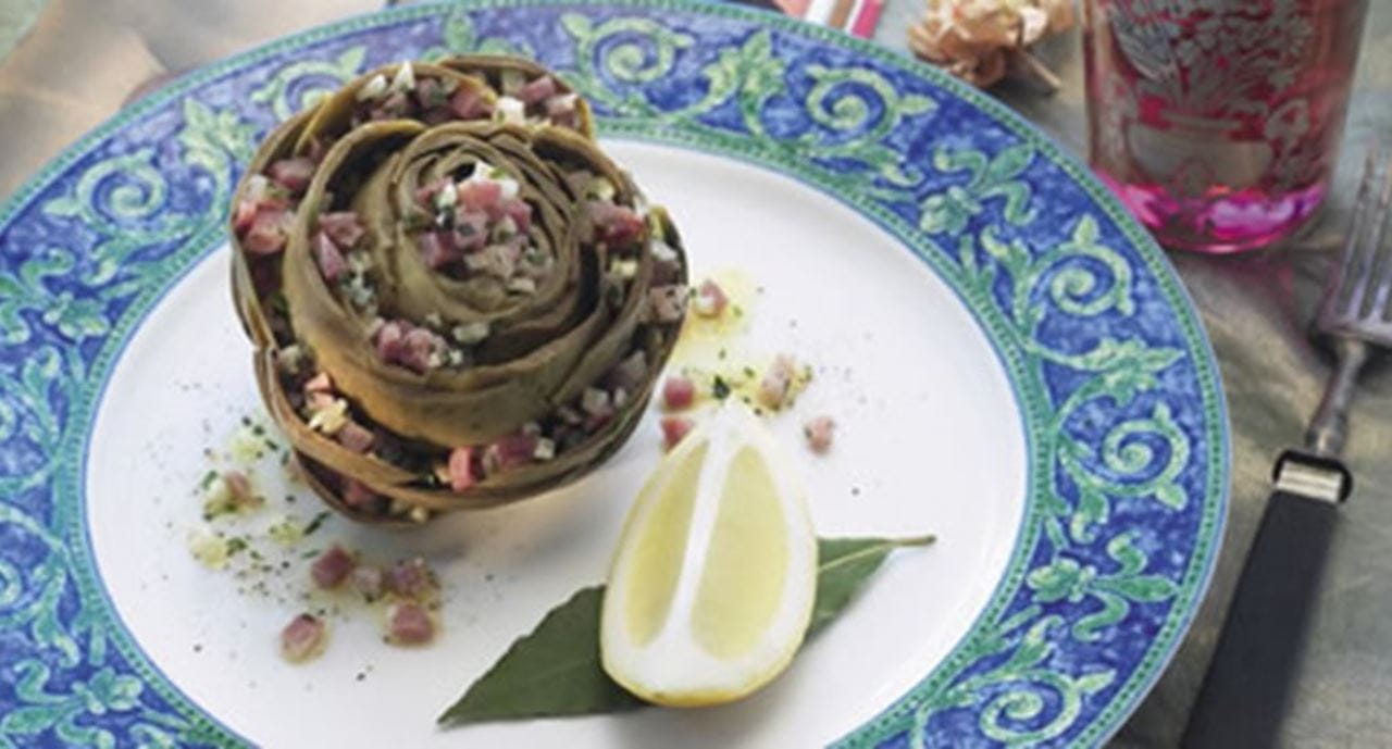 - Entretanto, pique o bacon em pedacinhos, descasque e pique finamente os dentes de alho. Misture bacon e o alho picado com a salsa picada. Recheie a parte central das alcachofras com este preparado, espalhando também algum entre as folhas.