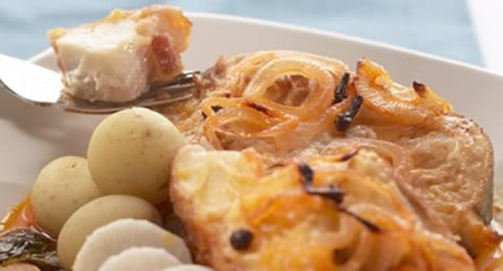 - Corte o toucinho em tiras finas e disponha-as sobre a cebolada. Leve ao forno durante 30 minutos.