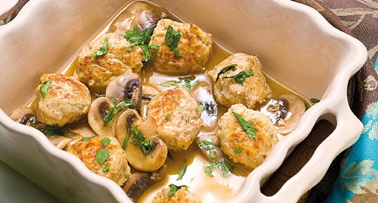 - Junte os cogumelos picados ao frango, adicione a cebola picada e o pão ralado e tempere com sal, pimenta e noz moscada. Ligue tudo com o ovo e molde em pequenas almôndegas, com a ajuda de farinha.