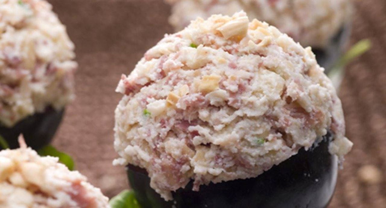 - Pique finamente o presunto, misture-o com as amêndoas e adicione à pasta de requeijão. Perfume com cebolinho picado e pimenta moída na altura.