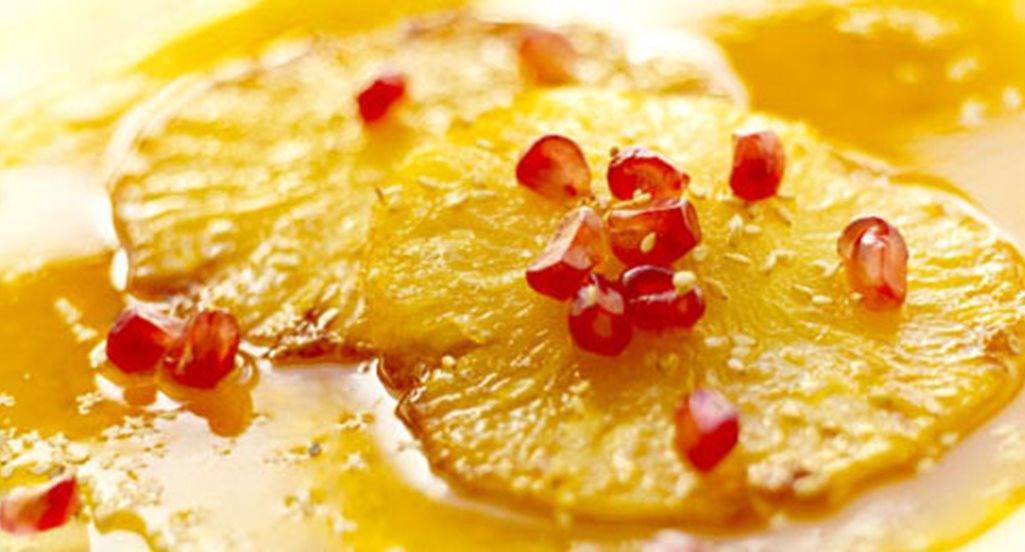- Deite a calda de laranja sobre o ananás, salpique com os bagos de romã e com sementes de sésamo.