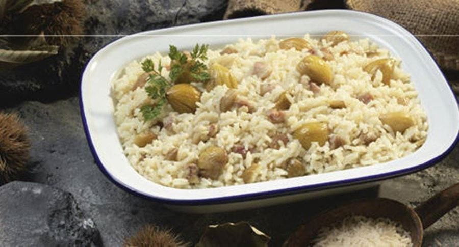 - Entretanto, descasque e pique a cebola e leve a alourar num tacho com a margarina Vaqueiro. Quando a cebola estiver dourada, regue com a água a ferver e junte o cubo de caldo de carne. Deixe retomar fervura e introduza o arroz, previamente lavado e escorrido. Mexa com um garfo e quando voltar a ferver introduza as castanhas escorridas. Mexa de novo com um garfo, rectifique o sal, tape o tacho e deixe cozer durante cerca de 12 minutos.