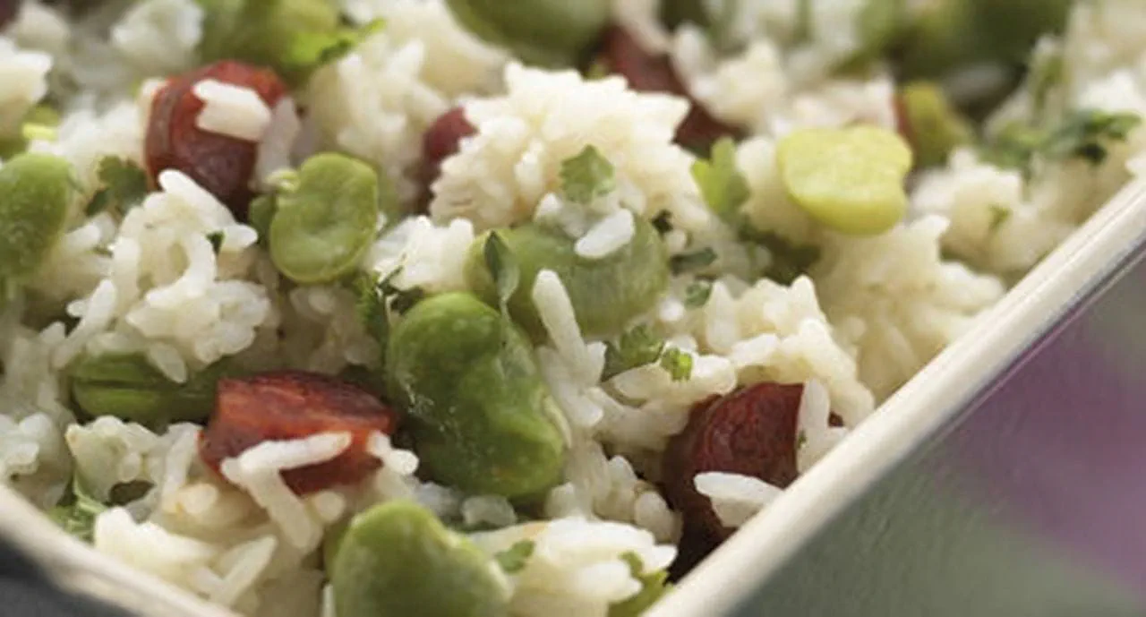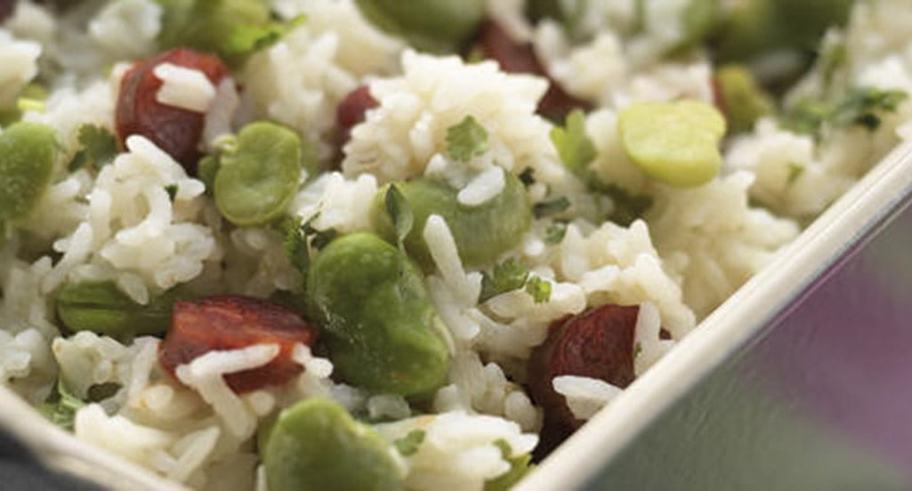 - Entretanto, tire a pele á linguiça e corte-a em rodelas e descasque e pique a cebola. Leve a cebola ao lume com a Vaqueiro com Azeite e as rodelas de linguiça. Assim que começar a alourar, junte o arroz, mexa e deixe fritar até ficar translúcido. Regue-o com 6 dl de água a ferver e junte as favas escorridas. Dê uma mexidela no arroz, tape o tacho e deixe cozinhar sobre lume brando durante cerca de 15 minutos.
