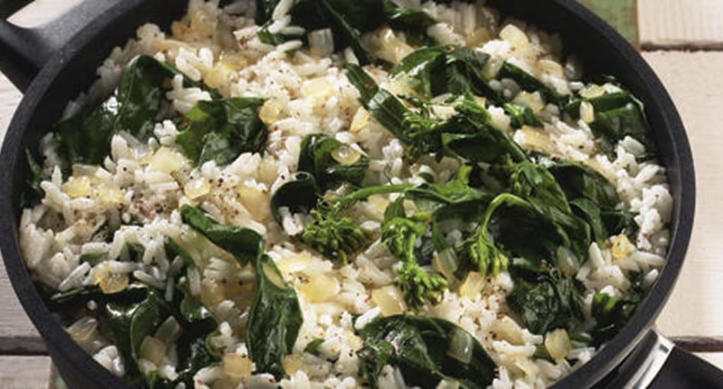 - Regue com a água a ferver e tempere com sal e pimenta. Deixe retomar fervura e introduza o arroz, previamente lavado e escorrido. Mexa com um garfo para soltar o arroz, tape o tacho e deixe cozinhar durante cerca de 13 minutos.