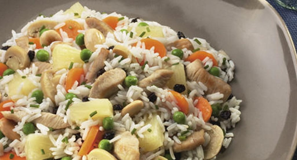 - de 10 minutos. Regue com a água a ferver, junte o cubo de galinha e mexa. Quando retomar fervura, introduza o arroz, tempere com sal e pimenta e deixe cozer, tapado durante cerca de 12 minutos. Junte o ananás cortado em bocadinhos, mexa de novo com um garfo e deixe retomar fervura.