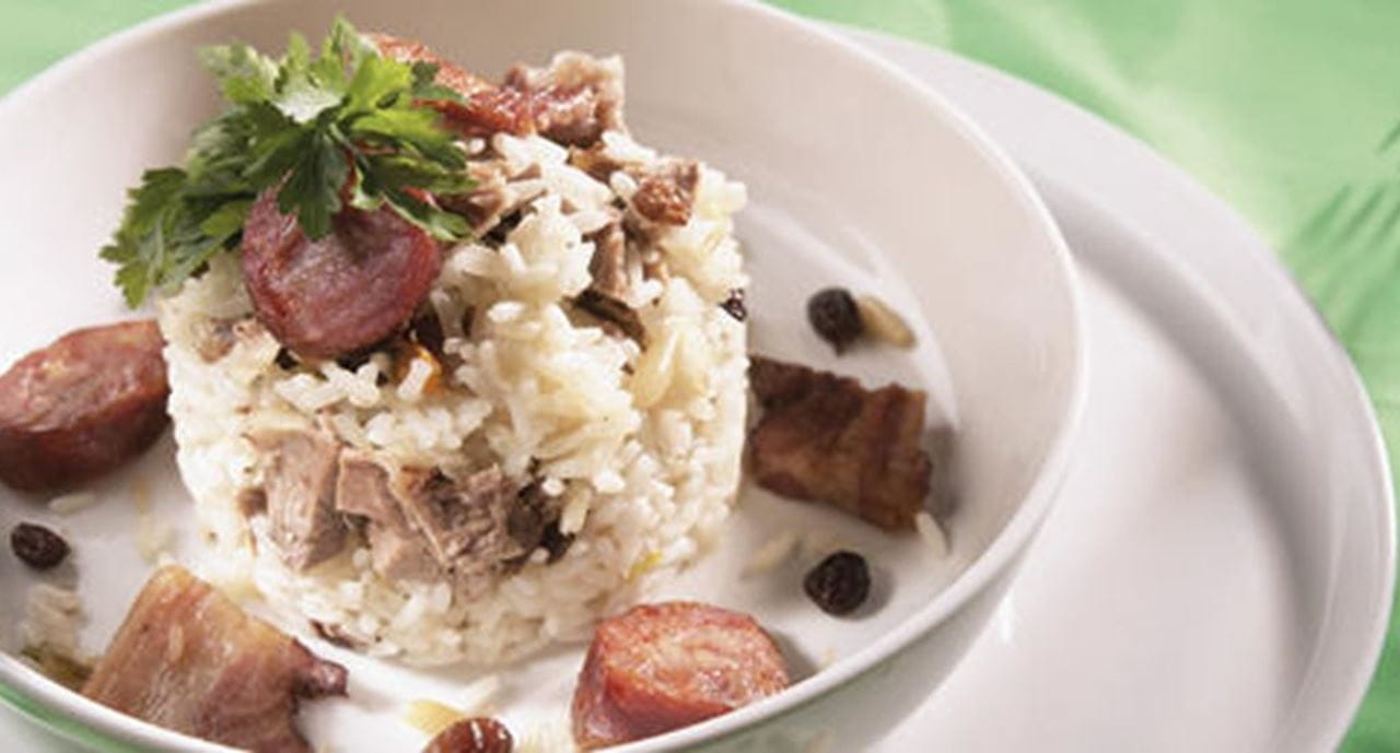 - Entretanto escorra o peru, o bacon e o chouriço do caldo onde cozeram. Deite fora os ossos do peru e desfie a carne. Corte o bacon e o chouriço em fatias. Junte as carnes ao arroz quando este estiver quase pronto, por cima enfeite com rodelas de chouriço e fatias de bacon e deite tostar