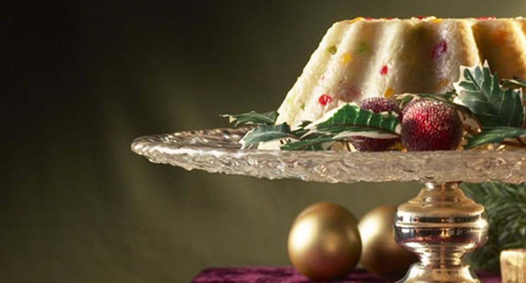 - Desenforme na altura de servir e enfeite com folhas de azevinho e cerejas em calda.. Passe as frutas cristalizadas por água quente para lhes retirar o excesso de açúcar e depois enxugue-as bem.