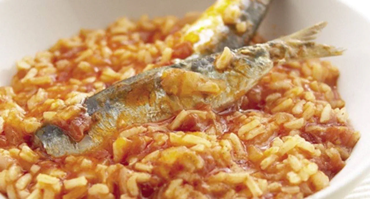 - Tape e deixe cozer durante cerca de 12 minutos. Coloque as sardinhas cuidadosamente por cima do arroz e deixe ferver mais 2 minutos.