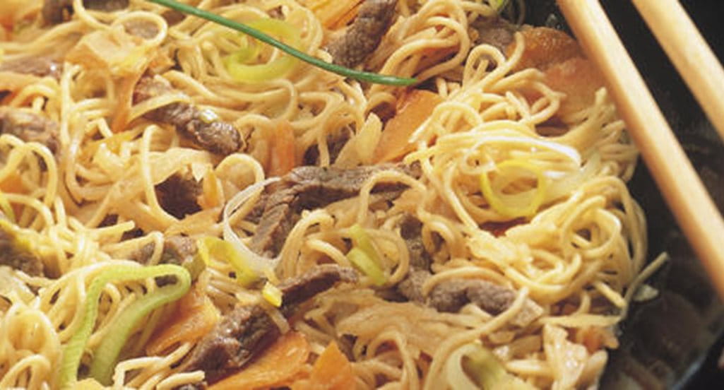 - À parte coza a massa chinesa durante 5 minutos. Escorra e junte à carne com os legumes. Mexa e sirva imediatamente.