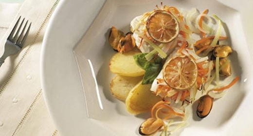 - 1. Coloque os lombos de bacalhau num tacho, junte 2 dentes de alho esborrachados e a folha de louro.