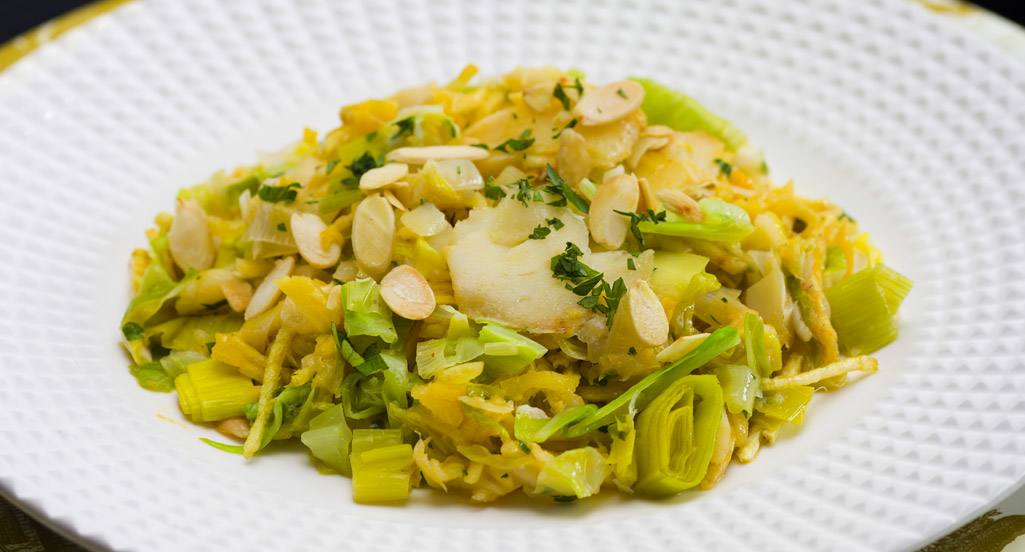 - 100 g de amêndoa laminada 2 cebolas 1 alho-francês 100 g de Vaqueiro Clássica
