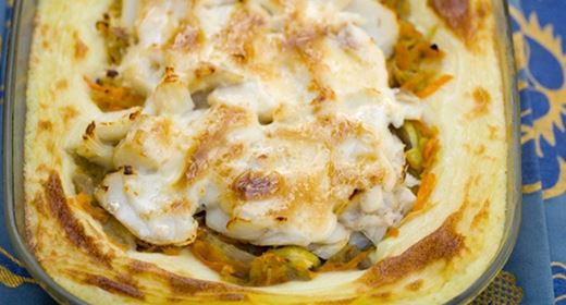 - Espalhe a cebolada sobre um tabuleiro de louça. Escorra os lombos de bacalhau e enxugue-os bem. Coloque-os sobre a cebolada e cubra com a mistura de morcela.