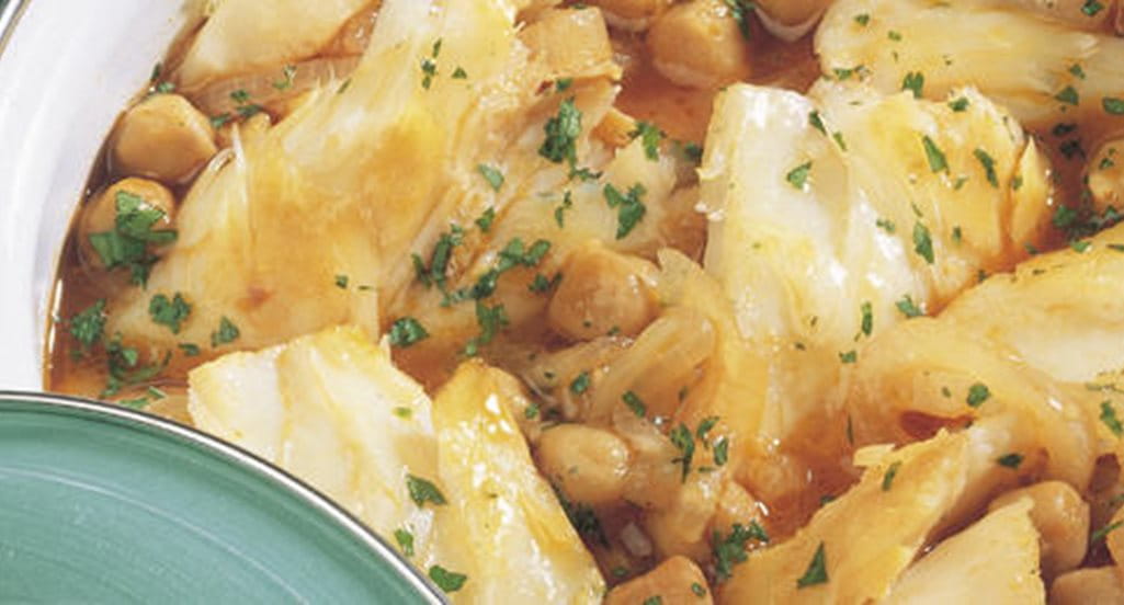 - Num tacho com o fundo espesso coloque, em camadas alternadas, as rodelas de cebola e de alho, o bacalhau e o grão, previamente escorrido. Regue com a polpa de tomate, dissolvida no vinho, e com o azeite. Tempere com um pouco de sal e pimenta e junte a folha de louro. Tape o tacho e deixe cozinhar sobre lume brando durante cerca de 45 minutos. Polvilhe com a salsa picada e sirva imediatamente.