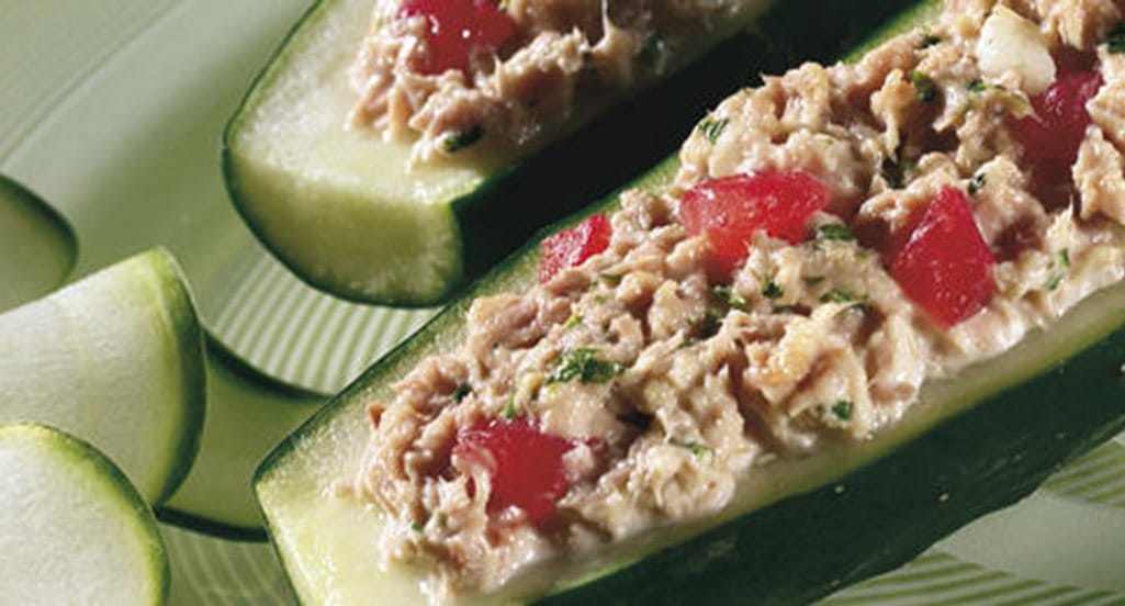 - Escorra o atum, esmague-o com um garfo e misture com a maionese e os coentros picados de modo a obter uma pasta. Tempere com pimenta. Junte à pasta obtida 1 tomate, cortado em cubinhos e a polpa que retirou dos pepinos, cortada também em bocadinhos.