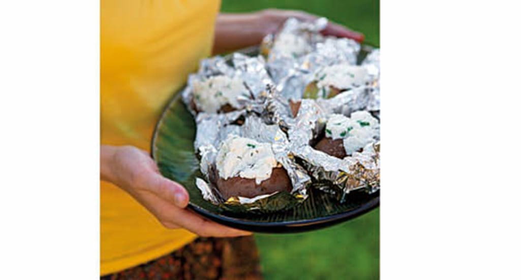 - Embrulhe as batatas no papel de alumínio e coloque-as sobre as brasas ou no grelhador durante cerca de 10 minutos.