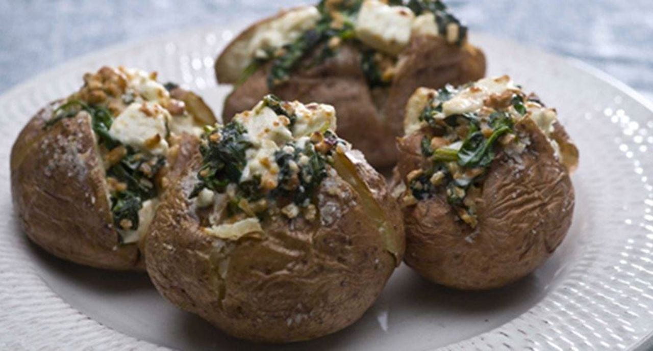 Batatas assadas com recheio de feta e espinafres