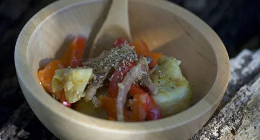 - Lave o tomate, limpe-o de grainhas e pique em pedaços. Misture tudo numa tigela, tempere com sal e pimenta moída na altura e junte as sementes de funcho, misture bem e mude para um tabuleiro de forno.