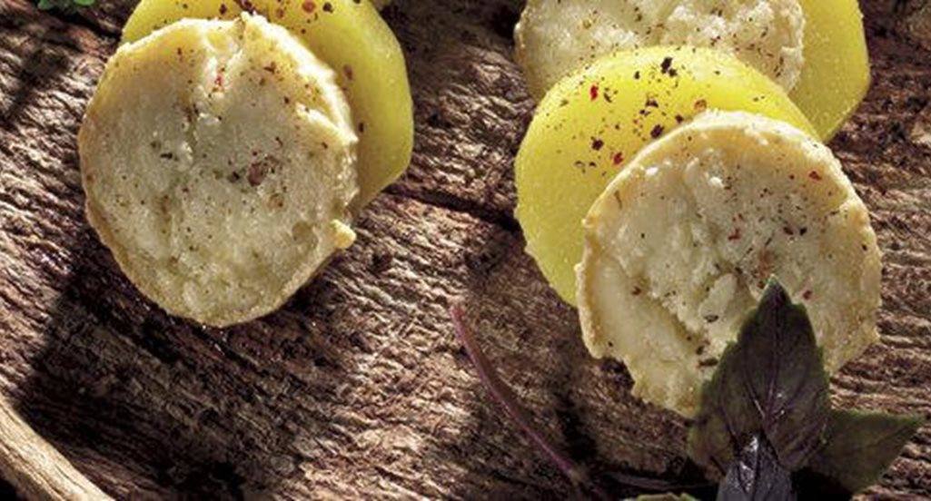 - Corte os queijos de cabra em rodelas com a mesma espessura e disponha as rodelas de batata, intercaladas com as rodelas de queijo, num prato que possa ir ao microndas e à mesa. Por cima, espalhe a margarina Vaqueiro em nozinhas, e tempere com pimenta. Tape o recipiente e leve ao micro ondas durante 6 minutos na potência máxima.