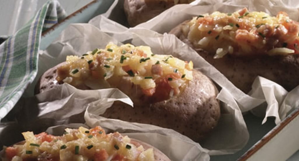 - Recheie as batatas com este preparado e leve a forno quente durante cerca de 25 minutos. Sirva imediatamente, acompanhadas com uma salada de legumes crus ou cozidos.