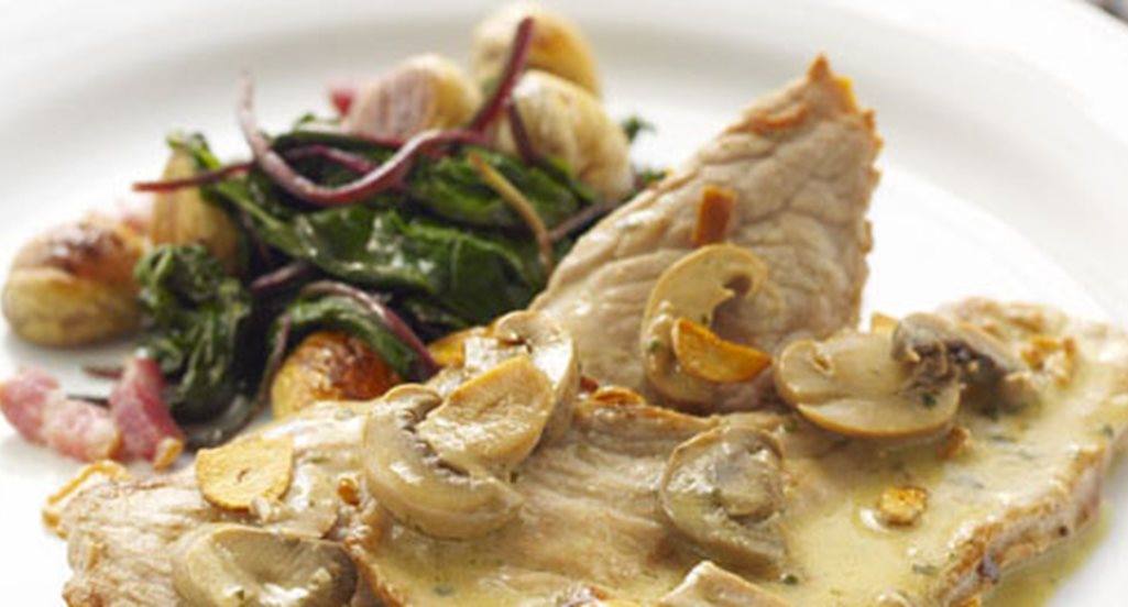 - Junte as natas aos cogumelos, adicione também o molho das bifanas, rectifique o sal e pimenta e deixe ferver 2 a 3 minutos. Deite tudo sobre as bifanas e sirva acompanhadas com as castanhas fritas e espinafres salteados.