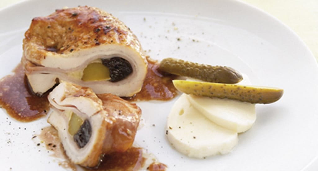 - Coloque 2 ameixas recheadas sobre cada bife, dobre ao meio e prenda com um palito.