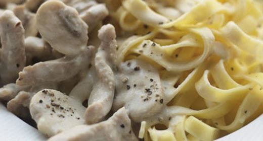 - Adicione à gordura da frigideira o vinho branco, mexa para dissolver os sucos e deixe ferver até reduzir um pouco. Rectifique o sal e pimenta.