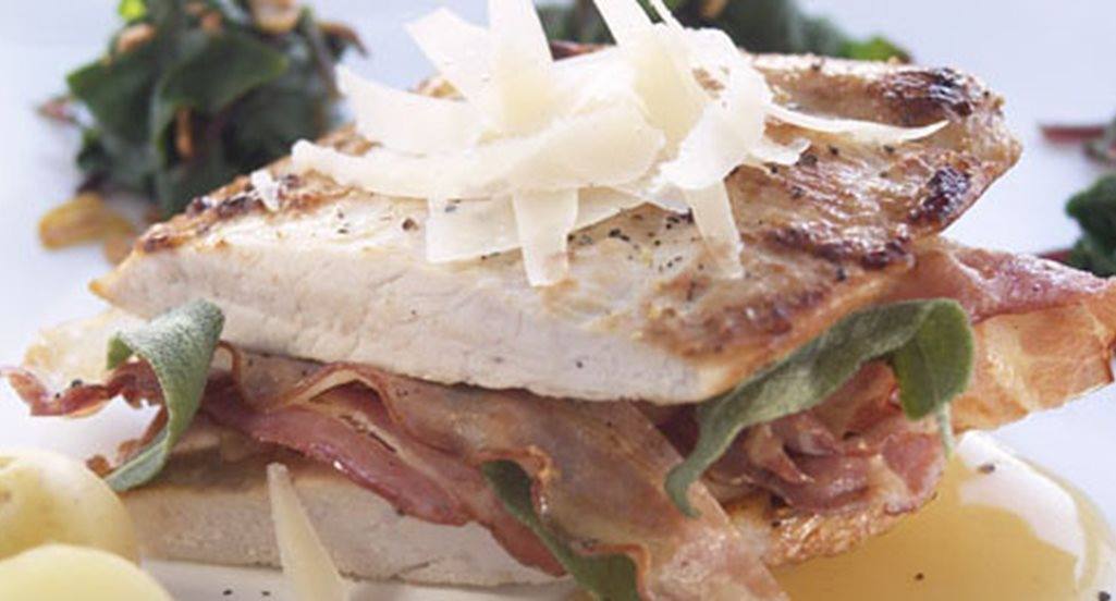 - Introduza os bifes na mesma frigideira e deixe alourar de ambos os lados. Corte os bifes ao meio e recheie 2 a 2 com as fatias de bacon e as folhas de salva.