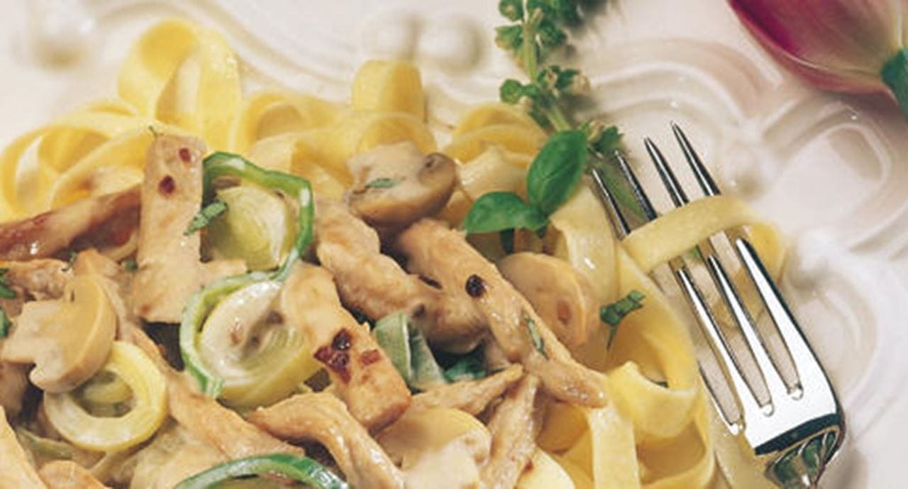 - Entretanto, coza o fettucine em água temperada com sal. Escorra e coloque na taça em que vai servir. Junte as natas aos bifinhos de peru e, logo que começar a ferver adicione o queijo, misturando bem. Deite sobre a massa e mexa. Polvilhe com manjericão picado e enfeite com algumas folhinhas inteiras.