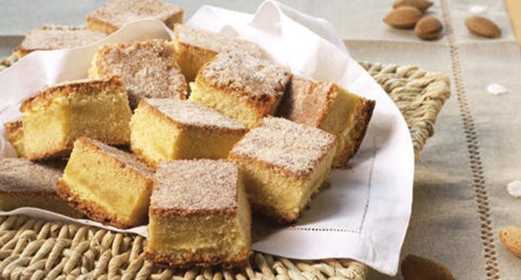 - Bata os ovos com o açúcar, junte a amêndoa e a farinha e misture muito bem. Deite a massa num tabuleiro rectangular, previamente untado com margarina Vaqueiro e polvilhado com farinha e leve a cozer em forno moderado. Desenforme e deixe arrefecer.