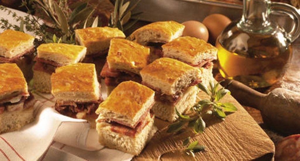 - fiambre e do presunto rasgadas em pedaços e metade do cozinhado. Cubra com outra placa de massa, e o recheio restante e tape com a restante placa de massa. Tape e deixe levedar durante mais 2 horas, tapado e em local quente.