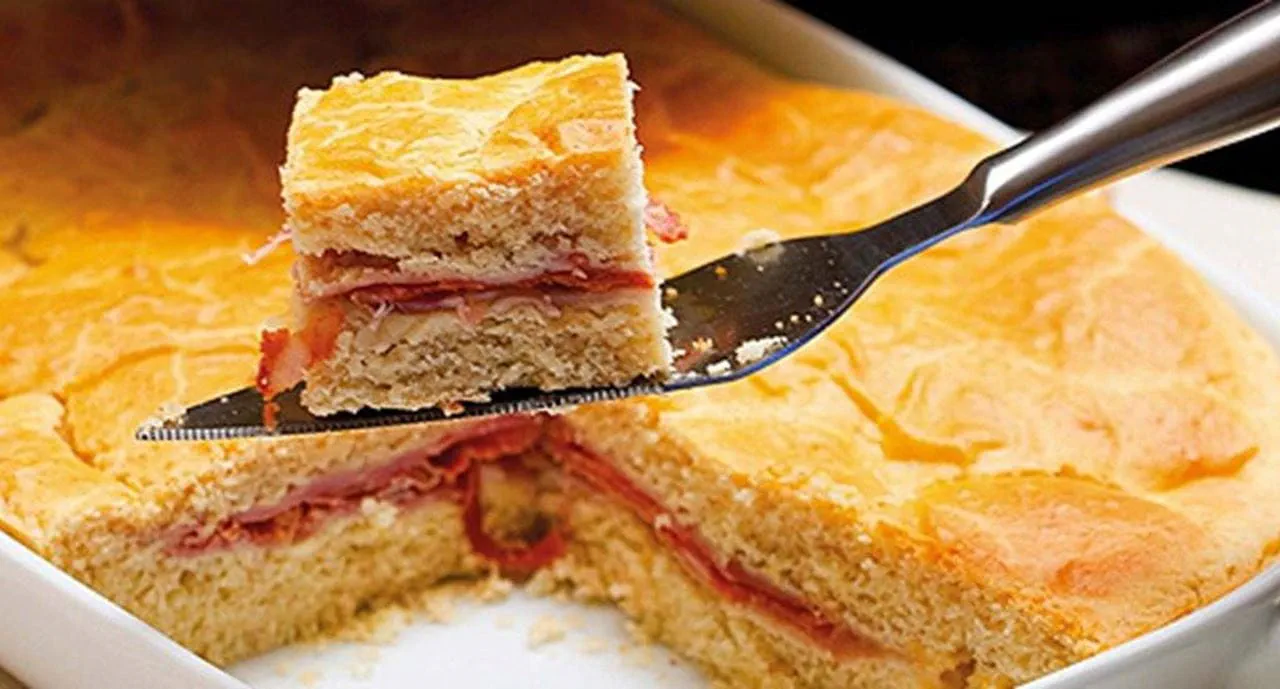 12. fiambre e do presunto rasgadas em pedaços e metade do cozinhado. Cubra com outra placa de massa, e o recheio restante e tape com a restante placa de massa. Tape e deixe levedar durante mais 2 horas, tapado e em local quente.
