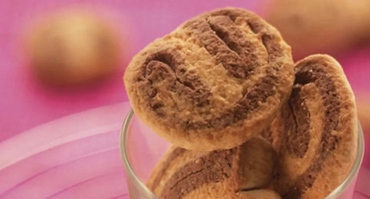- Misture a amêndoa com o açúcar e a farinha e adicione a margarina Vaqueiro cortada em pedaços. Esfarele-a com a ponta dos dedos de modo a obter uma massa com o aspecto de uma areia grosseira. Adicione as natas e amasse até os ingredientes estarem bem ligados. Divida a massa em duas porções. Adicione a uma delas ao cacau em pó e amasse de novo até o conseguir incorporar na massa.