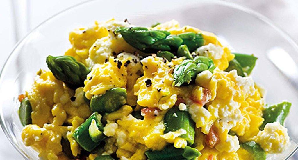 - Deite a Vaqueiro Alho na mesma frigideira, deixe derreter sobre lume moderado e adicione os ovos batidos, deixe-os coagular à medida que vai mexendo de vez em quando com uma espátula. Retire do lume e junte à mistura de espargos e bacon. Adicione o requeijão desfeito grosseiramente em pedaços e misture delicadamente.