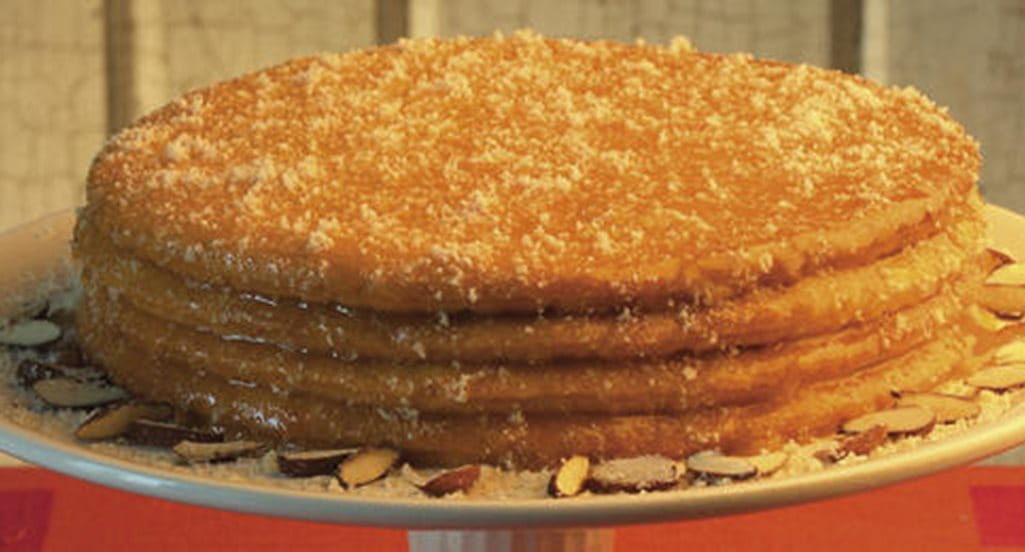 - Depois de cozidas retire as placas de bolacha do forno. Coloque-as umas sobre as outras no prato de serviço à medida que as vai barrando com o doce de ovos e polvilhando com a amêndoa, que entretanto ralou finamente. Termine cobrindo todo o bolo com doce de ovos e enfeite com amêndoa ralada.