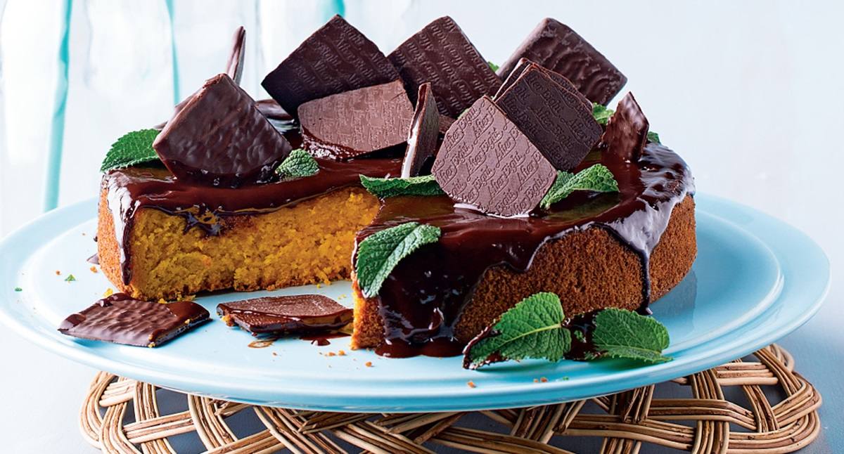 - Barre o bolo com o creme de chocolate e decore com as pastilhas de chocolate de menta.