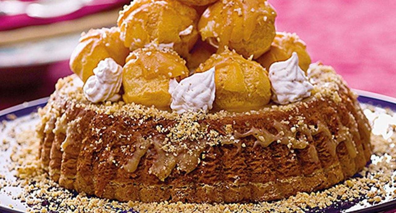 - Abra os choux com uma faca, recheie-os com o creme de “natas” e disponha-os sobre o bolo.