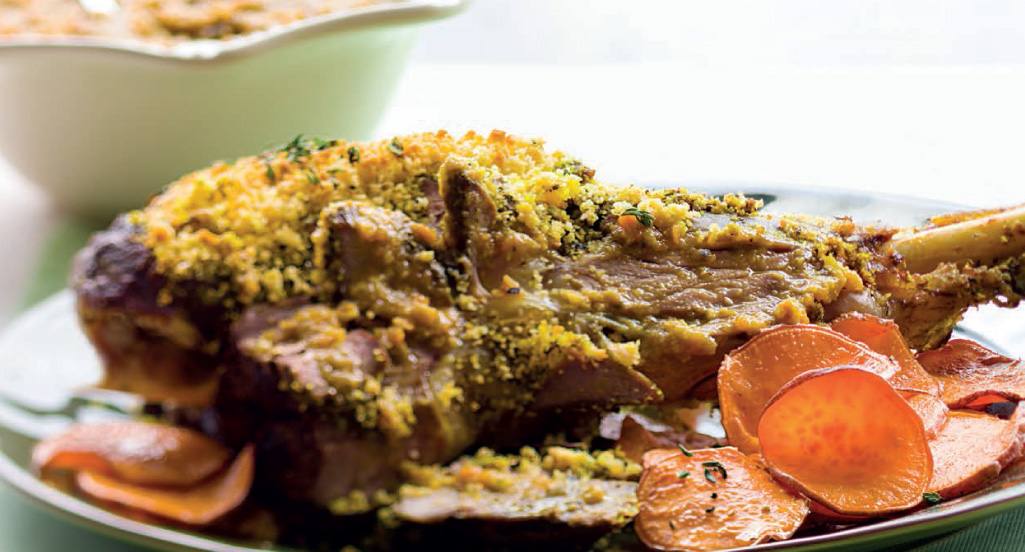 - 8. Quando terminar o tempo de forno retire a perna de borrego para outro tabuleiro e cubra-a com a mistura de broa.