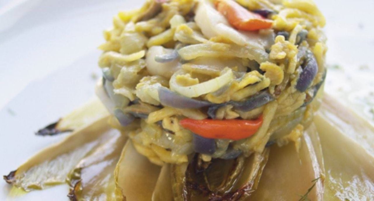 - Disponha as endívias abertas sobre os pratos de serviço e sobre elas coloque o bràs de vieiras, enformado com a ajuda de um aro metálico.