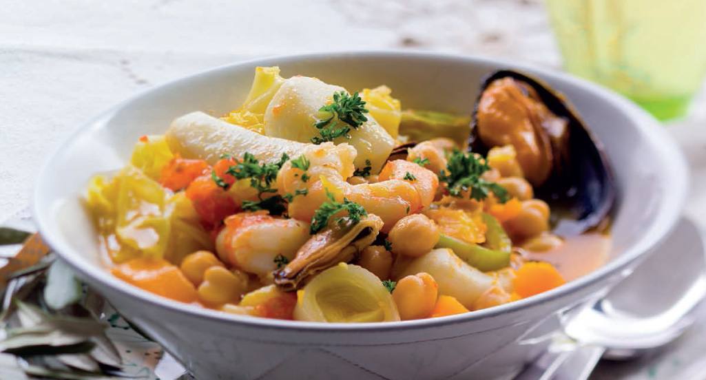 - Quem vai ao mar, vai cozinhar! 1. Retire a película branca mais opaca às tiras de pota, corte-as em pedaços e deixe descongelar dentro de um coador juntamente com o miolo de mexilhão e o de camarão. 2. Corte o alho-francês em rodelas, lave e escorra bem. Derreta a Vaqueiro Clássica e o dente de alho num tacho, junte o alho-francês e cozinhe sobre lume moderado enquanto corta a abóbora em dados. Deite a abóbora no tacho, mexa, tempere com sal e aumente um pouco o lume. 3. Lave os pimentos e a malagueta verde, retire-lhes as sementes e corte em rodelas. Escorra o grão e deite-o no tacho juntamente com os pimentos e a malagueta. Mexa, tape e reduza o lume. 4. Apare os talos mais grossos das folhas de couve-lombarda, corte em tiras largas e junte ao cozinhado. Misture bem, volte a tapar e deixe ferver suavemente durante cerca de 30 minutos, agitando o tacho de vez em quando. 5. Lave o tomate, corte-o em rodelas e limpe-o de sementes. Tempere a mistura de marisco com um pouco de sal. Disponha as rodelas de tomate sobre o cozinhado, por cima espalhe a mistura de marisco e volte a tapar o tacho. Passados cerca de 5 minutos mexa, retifique os temperos se for necessário e ferva durante mais 5 minutos com o tacho destapado.