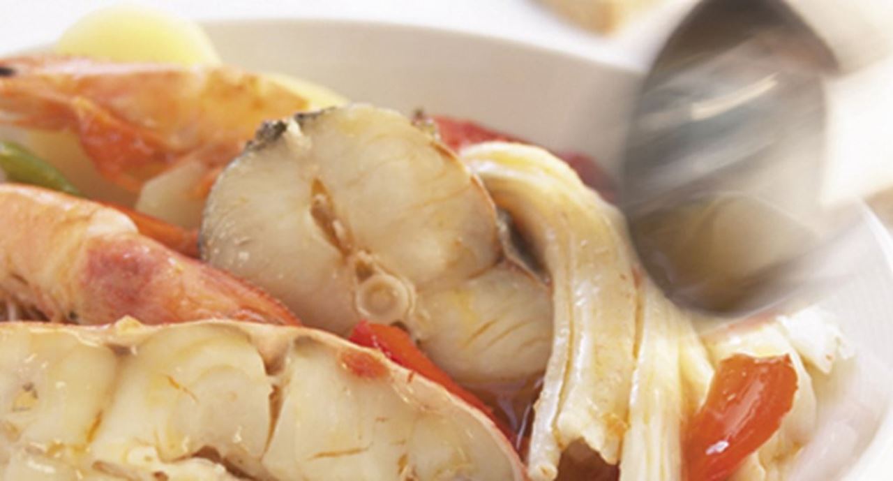 - Introduza os peixes e regue com um pouco mais de azeite. Tape e passados cerca de 10 minutos junte os camarões. Deixe cozinhar tapado mais 10 minutos. Se for necessário vá adicionando água quente aos poucos para que a caldeirada não seque.