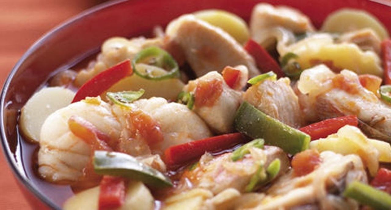 - Descasque a cebola, corte-as em rodelas finas e espalhe-as sobre o fundo do tacho. Pele as batatas, corte em rodelas e coloque por cima das cebolas. Lave e corte o pimento em tiras tendo o cuidado de o limpar de todas as sementes e peles brancas. Espalhe as tiras de pimento sobre as batatas. Lave o tomate, corte-o em bocados e disponha-o sobre os restantes legumes. Regue com o azeite, tape o tacho e leve a cozinhar sobre lume brando. Tape o tacho, agitando de vez em quando.