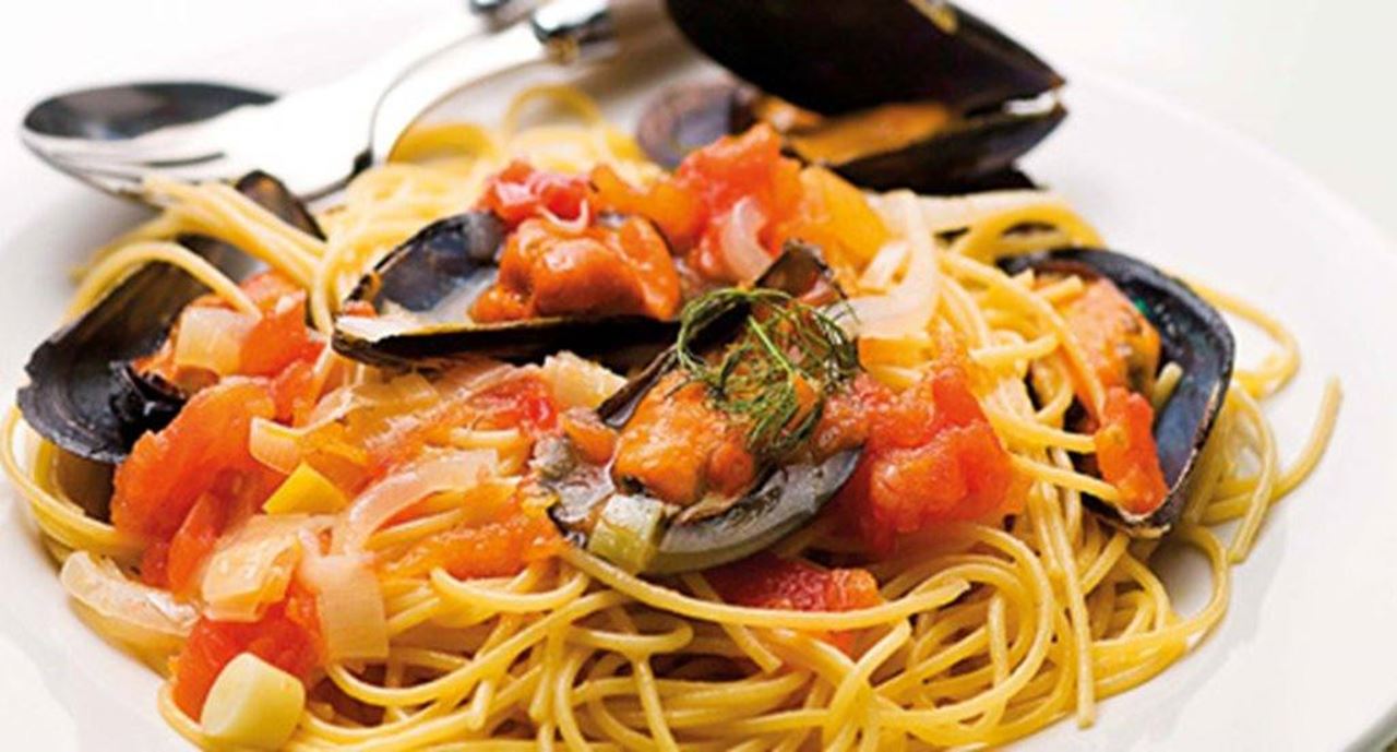 - Escorra o esparguete, divida-o por pratos de serviço fundos e por cima distribua os mexilhões e o molho. Salpique as folhinhas verdes do funcho.