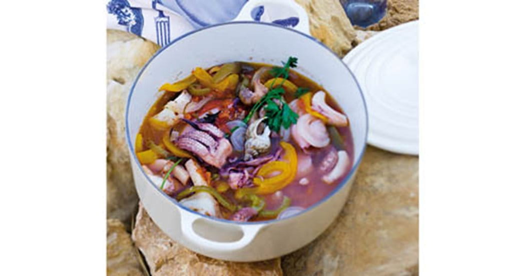 - Deite metade da Vaqueiro Clássicae os dois dentes de alho em pedaços sobre o fundo de um tacho. Por cima coloque em camadas metade dos legumes preparados, começando pelas rodelas de cebola e de alho francês, seguidas das rodelas de batata e do tomate. Por cima coloque os búzios, as lulas e as tiras de choco, junte o ramo de salsa atado e volte a repetir as camadas. Regue com o vinho branco, tape e deixe cozinhar sobre lume muito brando durante cerca de 45 minutos ou até as batatas e os moluscos estarem tenros.